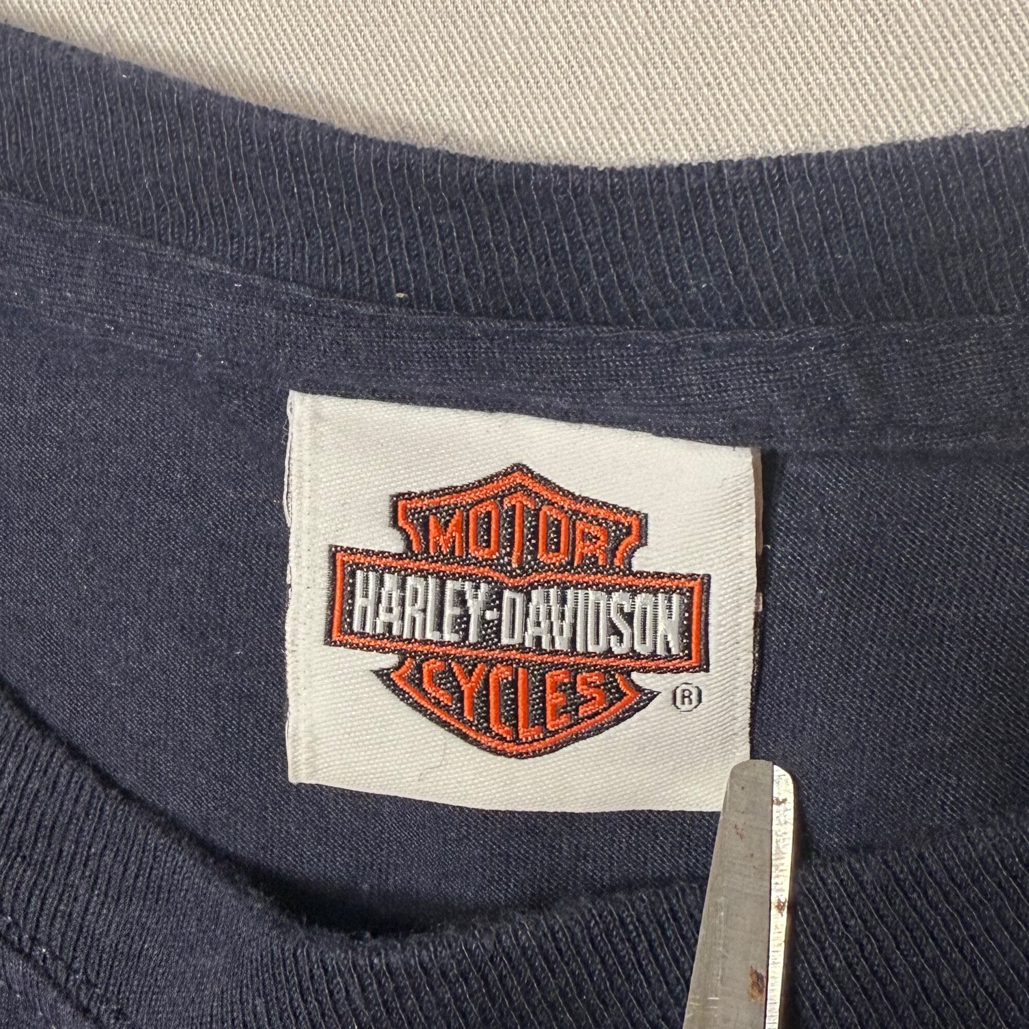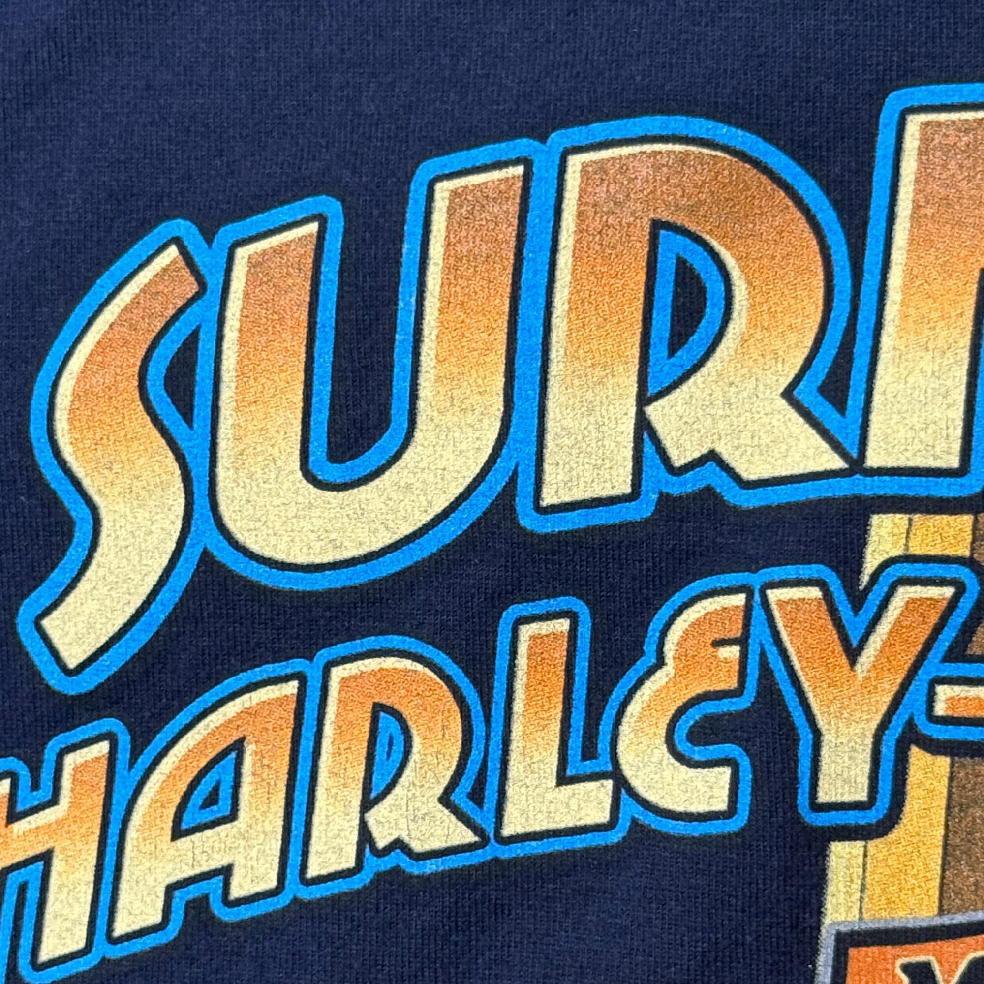 2000's ホンジュラス製 Harley Davidson ハーレーダビッドソン California スカル×サーフボード プリント ポケットTシャツ 半袖 ポケTee 紺 XL