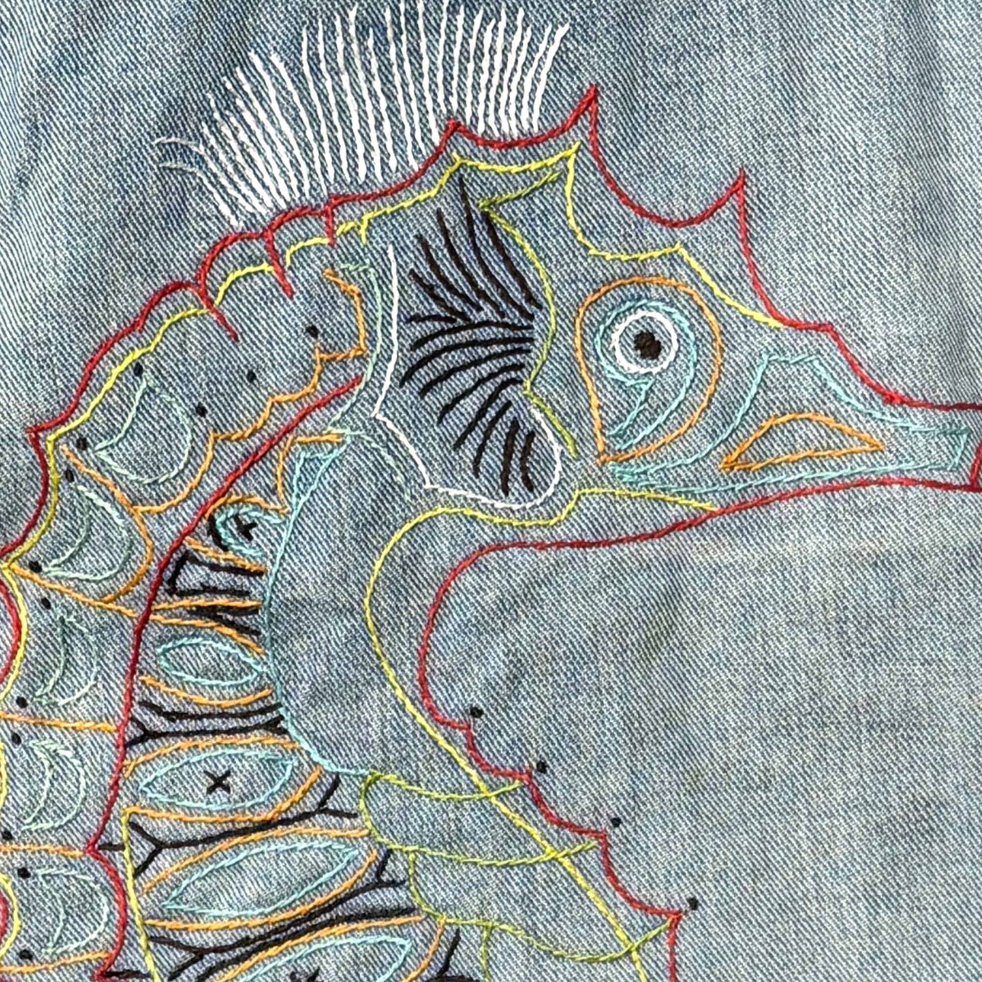 タツノオトシゴや孔雀等が刺繍された非常に雰囲気の良い商品です。当時のリアルなヒッピーが着ていた物だと思われます。