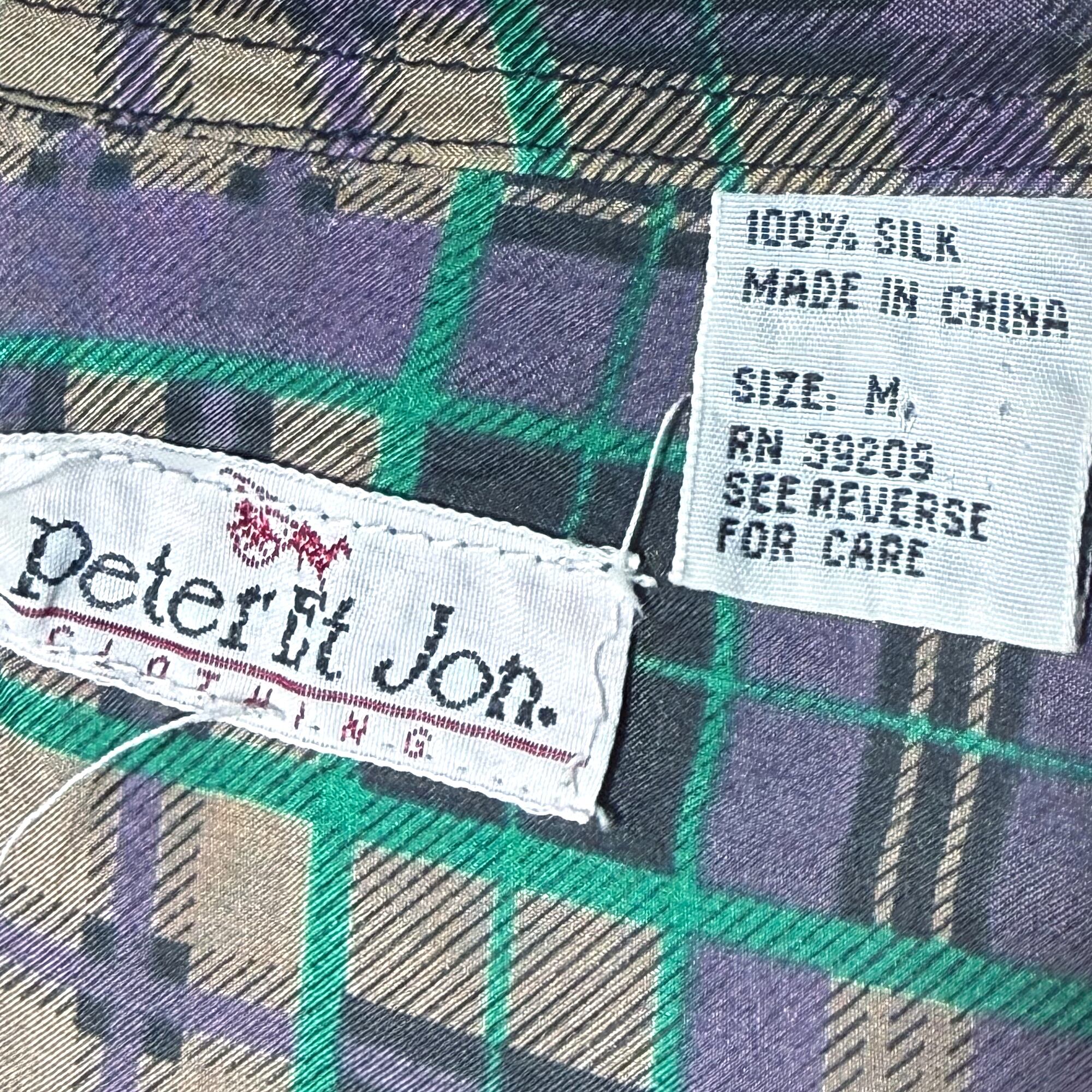 1980's 中国製 Peter Et Jon. 長袖 シルクシャツ チェック柄 緑・紫 M