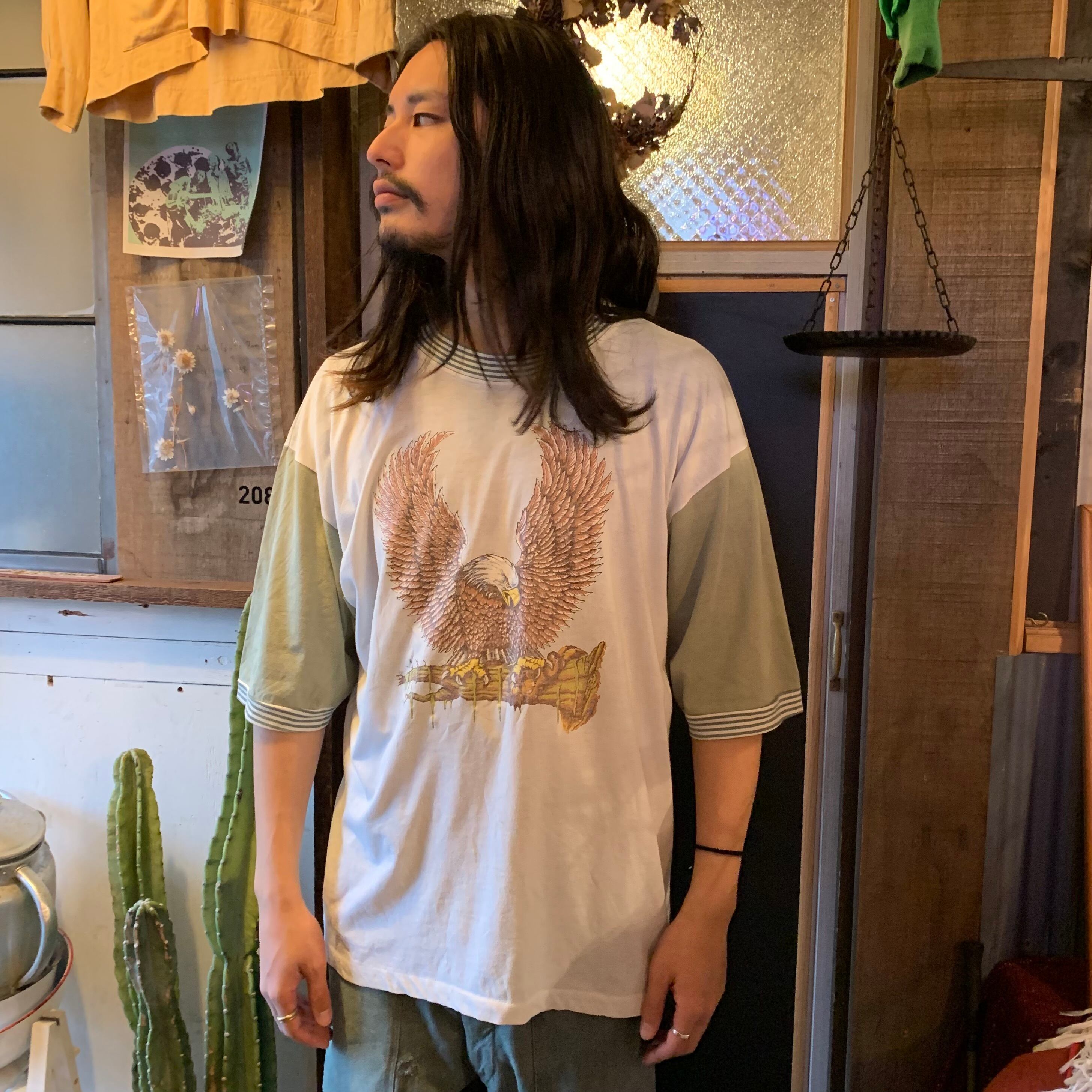 1970's USA製 イーグルプリント 五分袖 ボーダーリブ Tシャツ